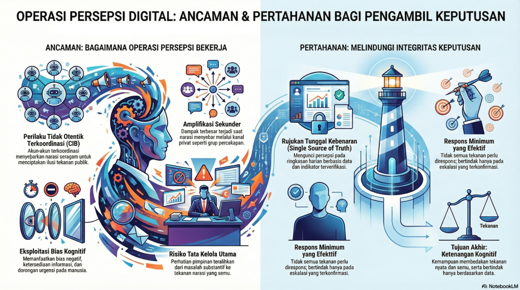 Perkembangan ruang digital telah mengubah lanskap pengambilan keputusan publik. Tantangan yang dihadapi para pengambil kebijakan hari ini tidak lagi semata bersumber dari krisis nyata atau kegagalan kebijakan, tetapi juga dari operasi persepsi—upaya sistematis untuk membentuk cara suatu situasi dipahami, dirasakan, dan dinilai, terlepas dari kondisi objektif yang sesungguhnya.